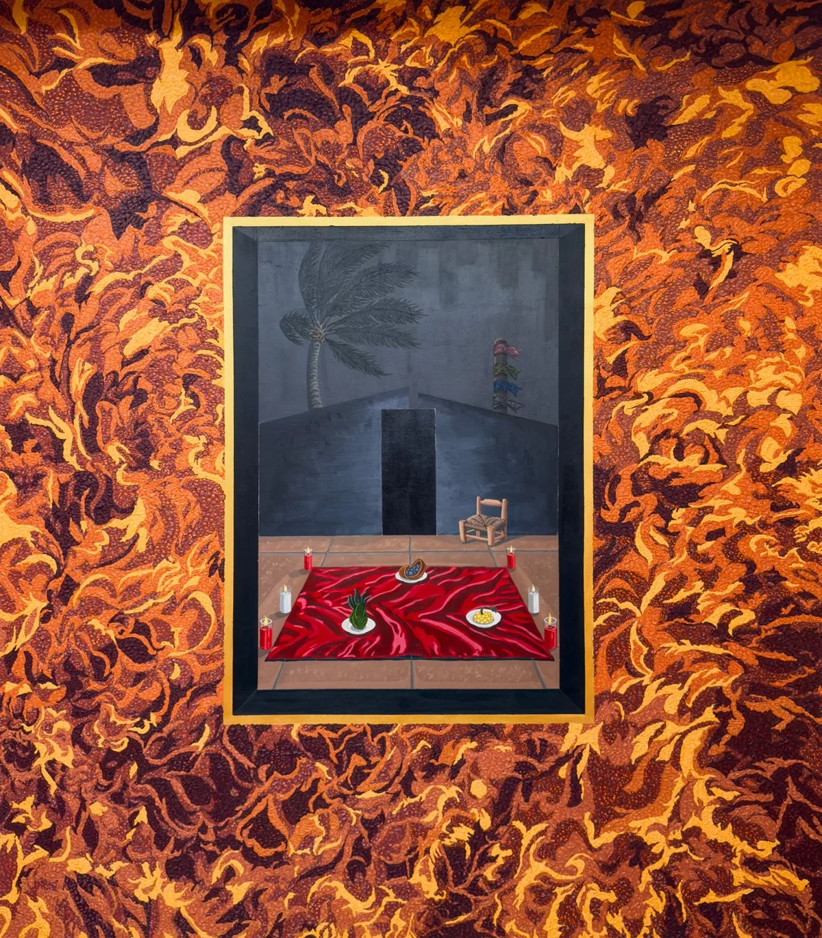 With this history as further fuel, Mere also deliberately pushes against familiar tropes of Black figuration and legibility. Rather than centering the body as the primary site of representation, the paintings center symbolism, ritual codes, and material signs. Figures are implied rather than fully depicted; meaning accrues through gesture, texture, and accumulated reference. Fire, flags, totems, and votive forms operate as signifiers that refuse easy readability, shifting the viewer’s attention towards recognition of spiritual symbols and metaphysics.